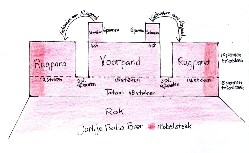 Allereerst heb ik een schema gemaakt, waarin aangegeven staat hoe het gebreide werkje eruit moet gaan zien, voordat we het in elkaar gaan naaien en afwerken. Ook kunt u even checken hoeveel steken u waar en wanneer op de pen moet hebben.