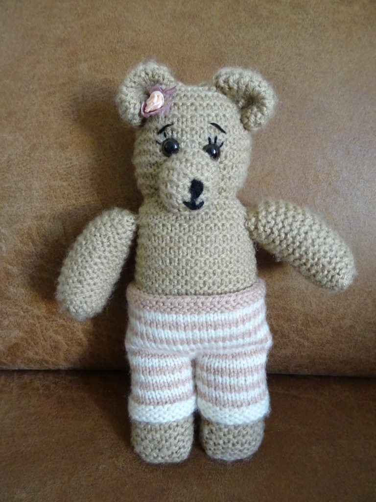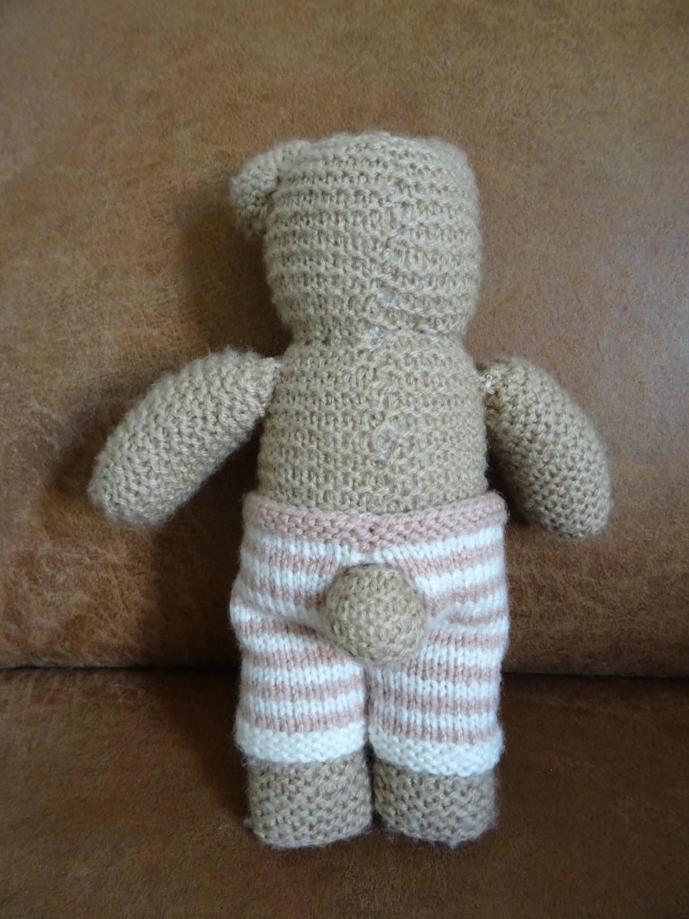 De pijpen breien we apart en voor elke pijp zetten we 24 steken op. We kunnen ze tegelijk breien door nog een bolletje wol te nemen. We breien eerst 5 pennen ribbelsteek. Dan wisselen we van kleur en breien 1 pen recht en 1 pen averecht. Wisselen we weer van kleur en breien we weer 1 pen recht, 1 pen averecht. In totaal doen we dit 5x, dus 10 pennen. De broekspijpjes zijn nu af en we gaan de beide pijpjes (alle 48 steken) als één geheel verder breien. Hierover gaan we 18 pennen in tricotsteek breien en wisselen 9x van kleur. Per kleur breien we telkens 1 pen recht, 1 pen averecht. Als laatste breien we 5 pennen in ribbelsteek, dat is alle pennen recht. In de laatste pen kanten we tegelijk alle steken af.