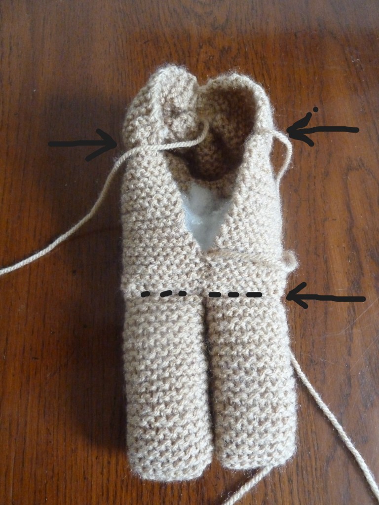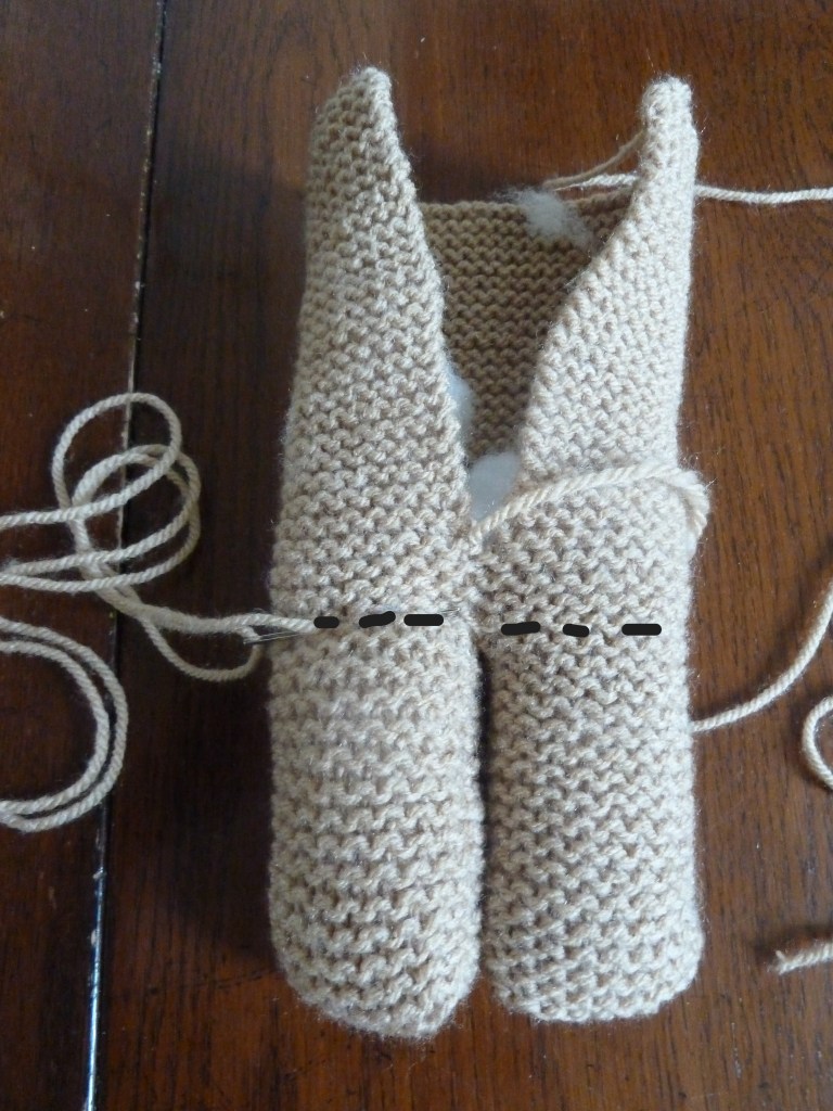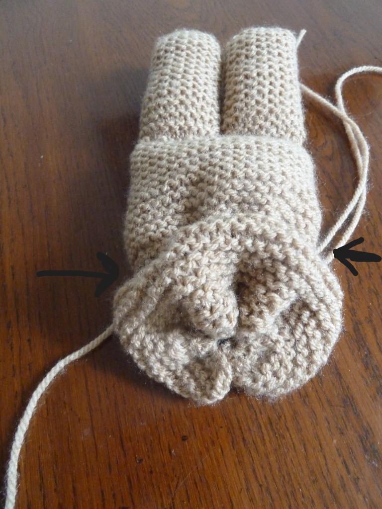 - Eén grote lap voor het lijf, hoofd en twee achterpoten. De pootjes worden als eerste gebreid. Voor 1 pootje worden 18 steken opgezet en 30 pennen recht gebreid (dit zijn 15 ribbels). Het is het mooiste om aan het begin van elke pen een kantsteek te breien, dit houdt in dat u de eerste steek van elke pen niet breit. De draad achter de pen houden en de tweede steek gewoon breien. Als de lengte van 15 ribbels bereikt is, de steken niet afkanten, maar op een hulpnaald zetten. Voor het andere pootje ook 18 steken opzetten en 30 pennen breien. Als deze ook af is, worden de steken van het andere pootje weer bij de naald opgezet en beide pootjes worden nu als één geheel verder gebreid. Dit gedeelte wordt het lijfje plus hoofd. Hiervoor moeten 50 pennen worden gebreid (dit zijn 25 ribbels). Daarna de steken losjes afkanten.