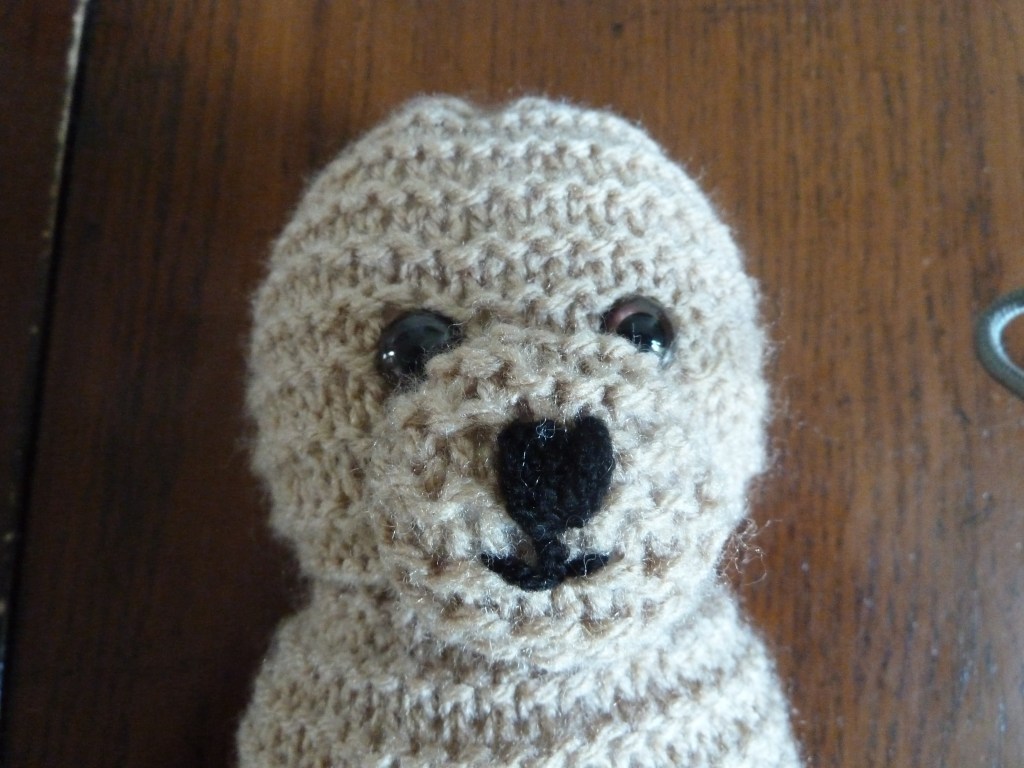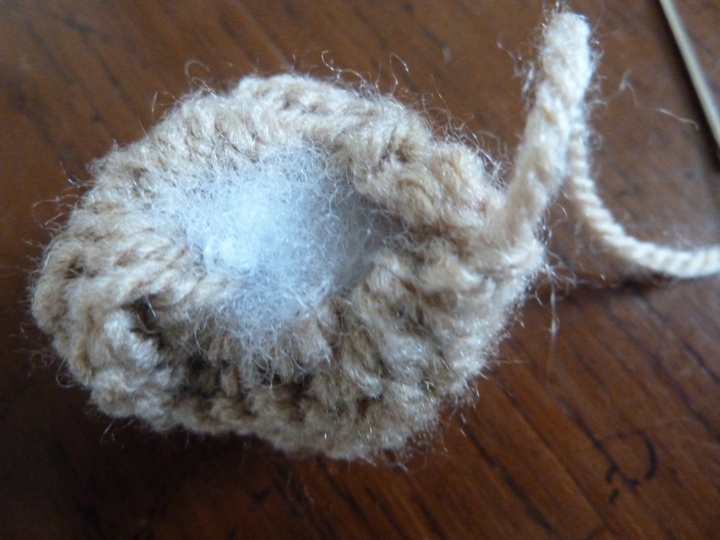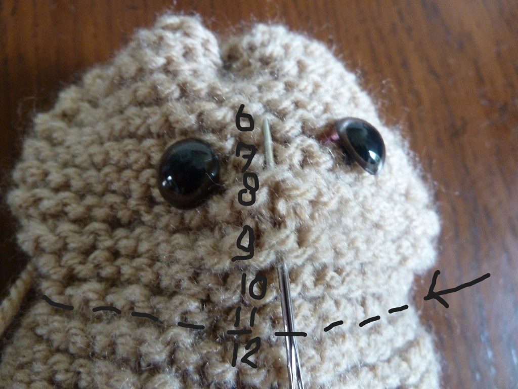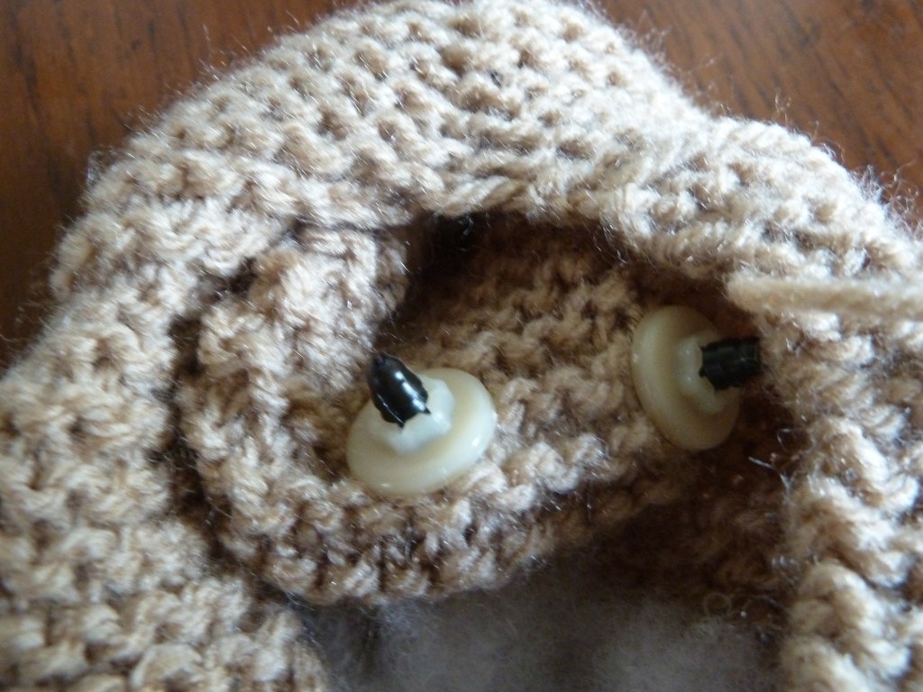 Foto 9 laat zien dat je een draad rijgt door alle randen van het lapje van het snuitje en de draad daarna aantrekt. Een opening houden, waardoor je het snuitje losjes op kan vullen. Foto 10: Het snuitje midden boven het nekje, ongeveer midden onder de oogjes vastnaaien. Het neusje met zwarte wol erop borduren, zie Foto 11. Op dezelfde wijze als het snuitje, het staartje maken en achterop naaien, zie Foto 12. Foto 13 en 14, laten zien dat je het lapje voor de oortjes dubbel moet vouwen en dan de zijkanten en onderkanten doorrijgen. Daarna weer de draad aantrekken en zie Foto 15 op het hoofdje vastzetten. Foto 16. Van de voorpootjes de onderkanten en zijkanten dichtnaaien, daarna losjes opvullen. Bovenkant pootje dichtnaaien en vastzetten op schouderhoogte aan het lijfje.