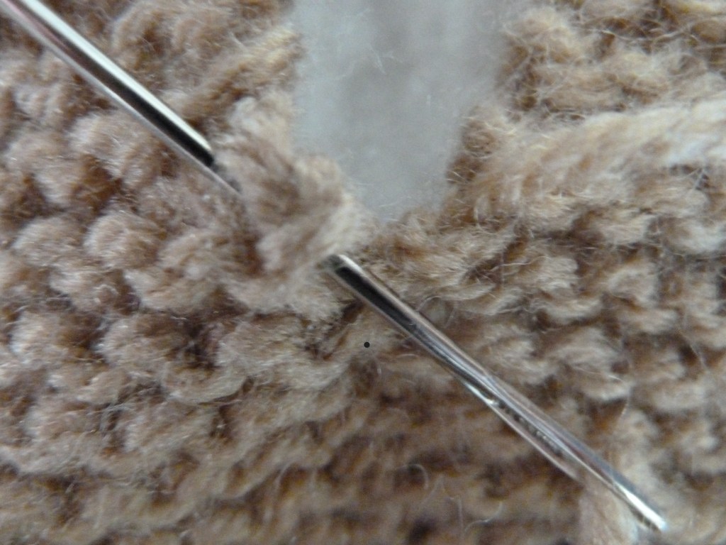 We beginnen met de grote lap. Op Foto 1 is te zien, dat de onderkant en zijkant van de pootjes worden gesloten. Op Foto 2 kun je zien hoe je dit het beste kan doen. Op de goede kant van het werk om de beurt een paar steken links en een paar steken rechts opnemen en dan de draad niet al te strak aantrekken. Pootjes losjes opvullen. Foto 3 geeft aan waar je de bovenkant van de pootjes met een draad moet doorrijgen, zodat de pootjes gebogen kunnen worden en de beer kan zitten. Foto 5 en 6 laten zien dat je voor de nek een draad tussen de 11e en 12e ribbel van bovenaf gerekend, moet rijgen. Voordat je de draad aantrekt hier even het lapje dubbelvouwen en de middelste steek vinden tussen ribbel 6 en 7 van bovenaf gerekend. Markeer deze met een stukje wol of een klein veiligheidsspeldje . Dit punt is belangrijk voor het bepalen van de plaats van de ogen. Foto 4 laat zien hoe we een draad door de bovenkant van het werk rijgen en trekken deze draad aan. Foto 6 laat zien, dat hierdoor een rondje ontstaat. Aan de binnenkant van het hoofdje, het rondje nog een paar keer doorsteken, zodat de randjes naar elkaar toe getrokken worden en het rondje kleiner wordt. Zijkanten rug aan elkaar rijgen en een kleine opening vrijlaten om op te vullen. Als het hoofd nog niet opgevuld is de veiligheidsogen vastzetten. Zoek opnieuw de middelste steek (gemarkeerd met stukje wol of veiligheidsspeldje) op de foto heb ik hier een naald doorgestoken. Dan met 3 steken tussenruimte (het markeringspunt er precies tussenin leggen) de ogen vanaf de voorkant door het breiwerk duwen en de veiligheidssluiting er aan de achterkant tegen aandrukken. Het oog zit nu vast. Doe het niet te gehaast, het is een heleboel werk om deze weer te verwijderen. De draad, die we voor de hals tussen ribbel 11 en 12 hebben geregen, kan nu aangetrokken worden. Hoofdje en lijfje heel stevig opvullen en de opening dichtnaaien.